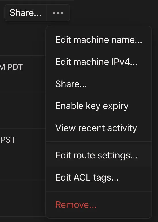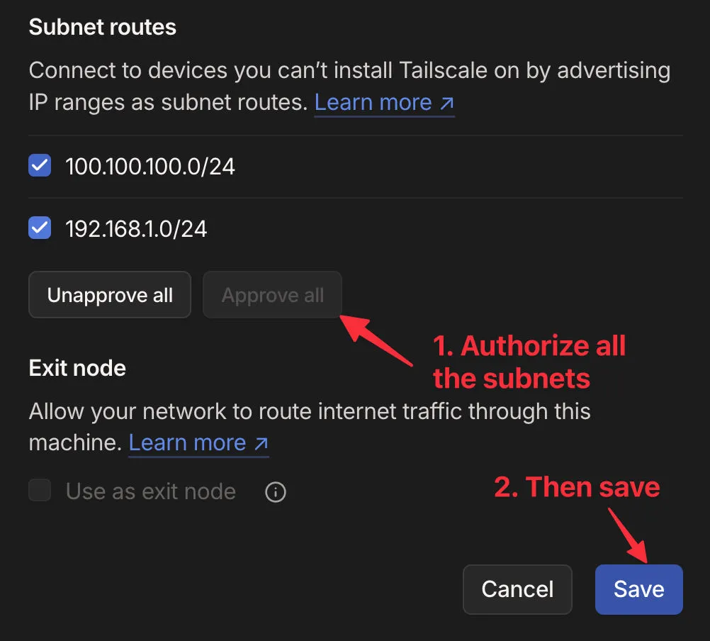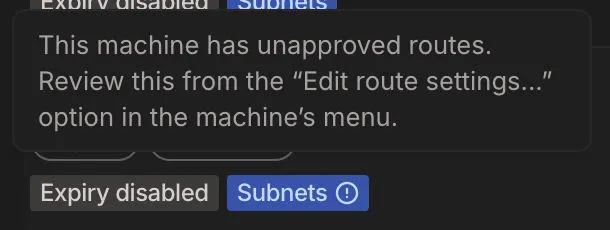 Now for the last step of this part of the guide, you should enable the virtual subnet in the Tailscale Admin Console via https://login.tailscale.com/admin/machines. When you open the page, you should see a little exclamation icon near the subnets of that machine, telling you that there are some unapproved routes.
