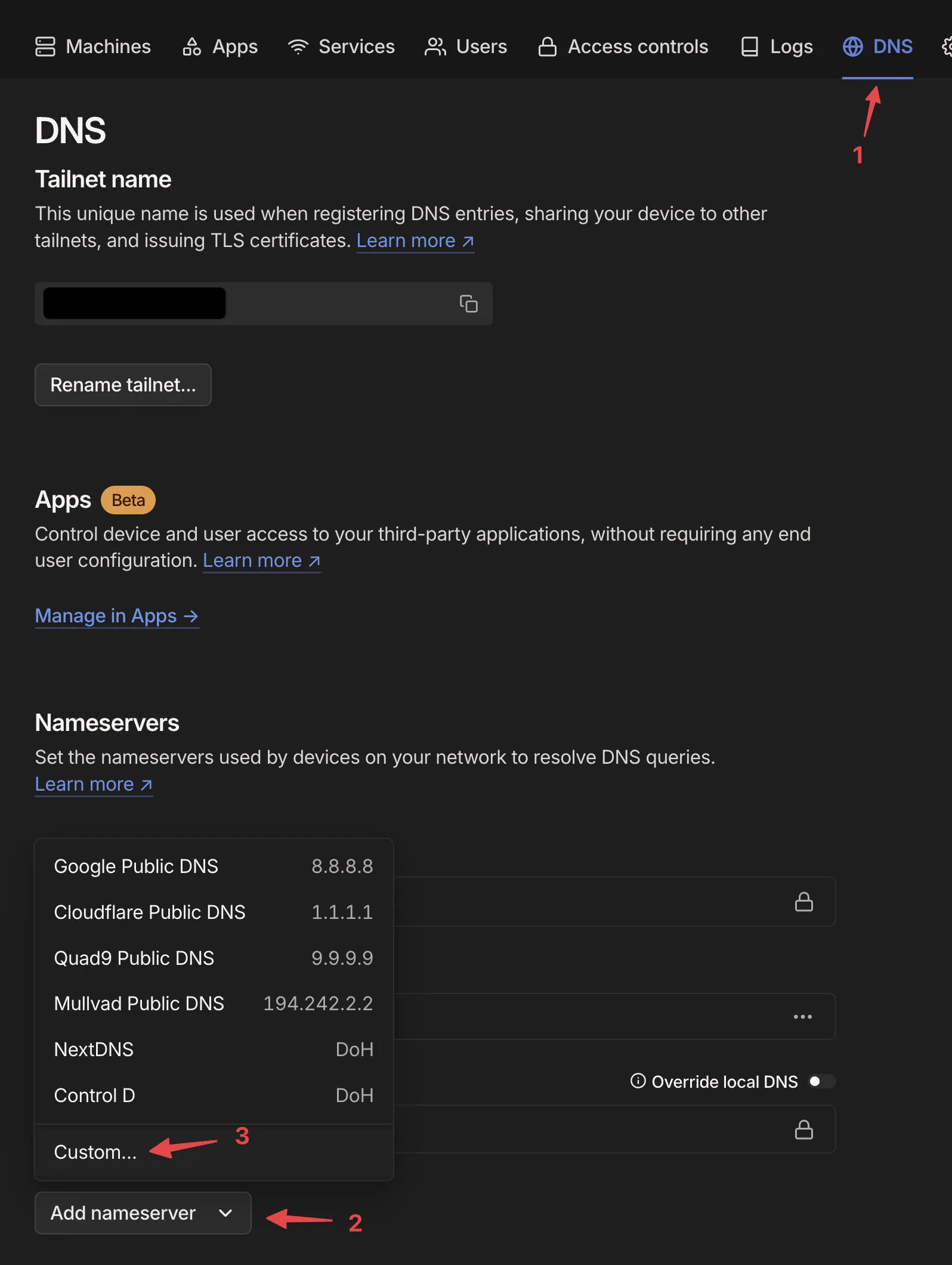 Then in the Tailscale Admin console, set the nameserver that uses the virtual subnet under DNS → Add nameserver → Custom…