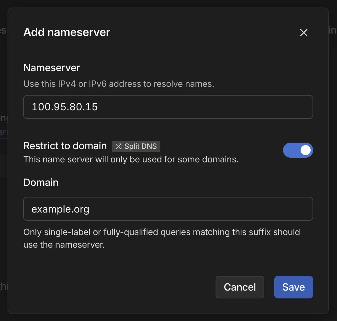 Fill out the nameserver field with the internal Tailscale IP of the machine with the Tailscale DNS server. Check “Restrict to domain” and add the domain or subdomain that you want to use for the split DNS (it should be the same as in the dnsmasq configuration).