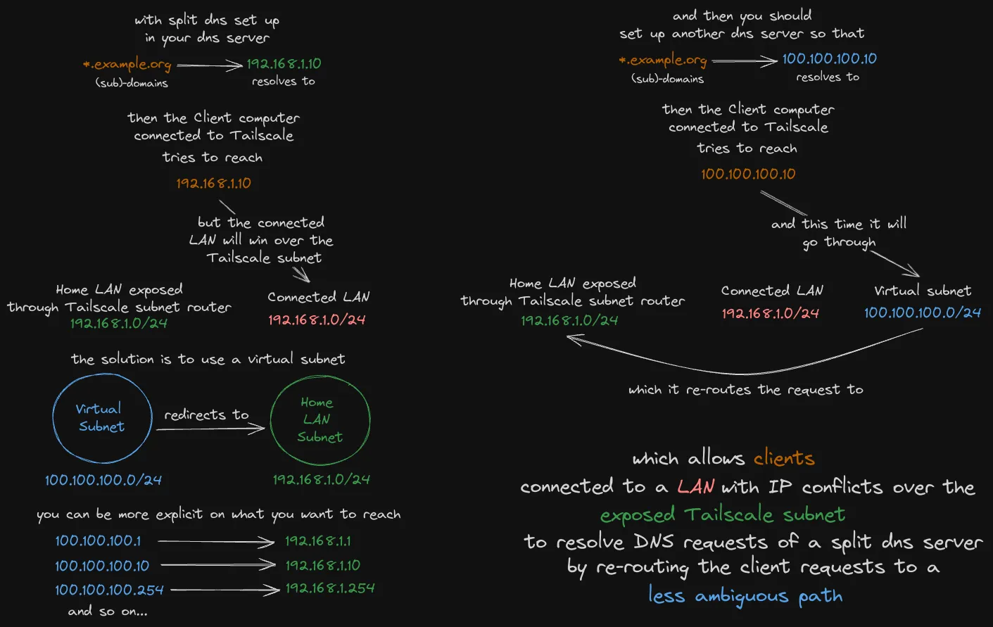 When using Tailscale to access your home network remotely, you might run into IP address conflicts if your home network’s subnet overlaps with the network you’re connecting from. This can stop you from accessing services on your home network using local DNS names. Plus, setting up split DNS for Tailscale can be a bit tricky when dealing with these conflicts.
